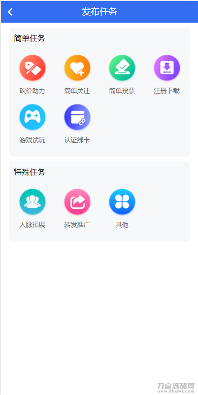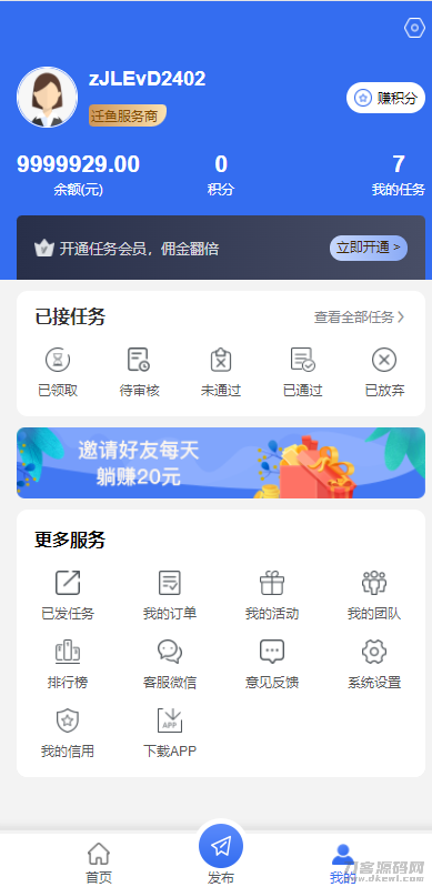 任务管理:包含平台的任务列表和用户任务列表,以及任务订单的相关管理。
