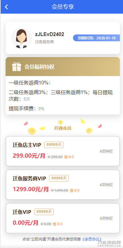 会员功能:会员可以根据不同的等级设置任务返佣比例,以及提现手续费和发布任务置顶次数的赠送问题。会员做任务的价格与普通用户做任务的返佣不同。