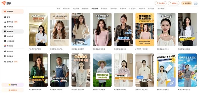视频智能创作:基于蝉镜积累的5000+爆款数字人模板,系统可自动匹配场景、音乐和文案。