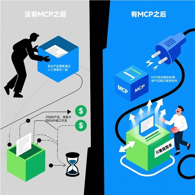 Diffusion的图像创作)像“乐高积木”般自由组合,无需繁琐的API开发即可实现功能调用。例如,企业只需向MCP系统输入“制作产品宣传视频”指令,AI便能自动协调文案生成、素材匹配、视频剪辑等流程,将原本需要多部门协作的复杂任务压缩至分钟级完成。这种“需求即服务”的模式,使企业运营效率提升300%以上,开发成本降低90%。