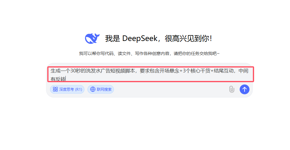 输入精准指令:在对话框中输入类似指令:“生成一个30秒的洗发水广告短视频脚本,要求包含开场悬念+3个核心干货+结尾互动,中间有反转”。