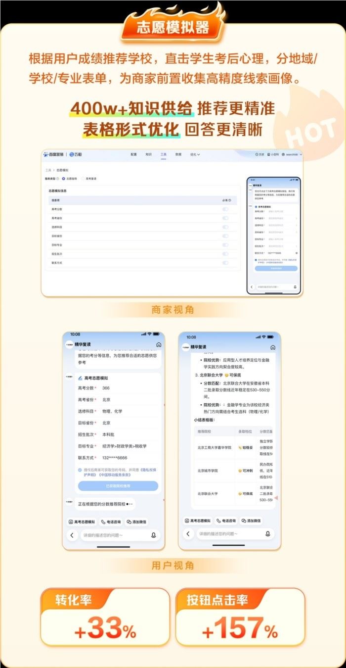 为了提升商家及用户体验,智能体也进一步降低使用门槛,新增高考分数/教师应聘澄清项。针对高考季志愿报考业务和复读业务的客户,上线“爆款功能”高考志愿模拟工具,根据学生成绩、省份、文理科、冲刺省份等推荐合适的学校,通过超400万知识供给及结构化展示让智能体更加“聪明”,直击考生考后心理,成为考生专属的“志愿小助手”;“学校模版”功能将会突出经营性质,提升家长信赖值,提升开口率。助力更多像龙门育才这样的教育行业同路者春风化雨,点石成金。