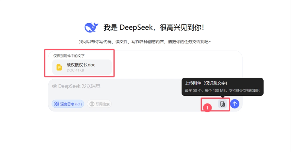 2、上传合同文件:在 DeepSeek 的操作界面中,找到文件上传入口,点击上传,选择准备好的合同文件,等待文件上传完成。