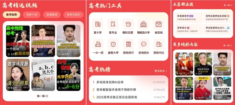 自5月27日起,快手集结名校名师、教育专家、医生学者等泛知识领域优质创作者,全力打造“高考备考期”“高考加油站”“高考志愿期”三大内容专题,将为考生家庭提供覆盖考前、考中、考后全链路的实用信息与暖心陪伴。