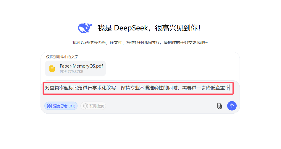 2、输入降重指令与段落:在 DeepSeek 的输入框中,输入清晰、准确的降重指令。例如,“对重复率超标段落进行学术化改写,保持专业术语准确性的同时,需要进一步降低查重率”。