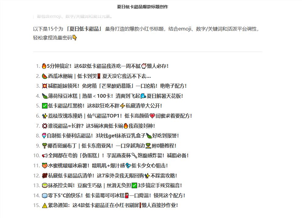 2、输入指令比如:请为"夏日低卡甜品"生成15个爆款小红书标题,要求: